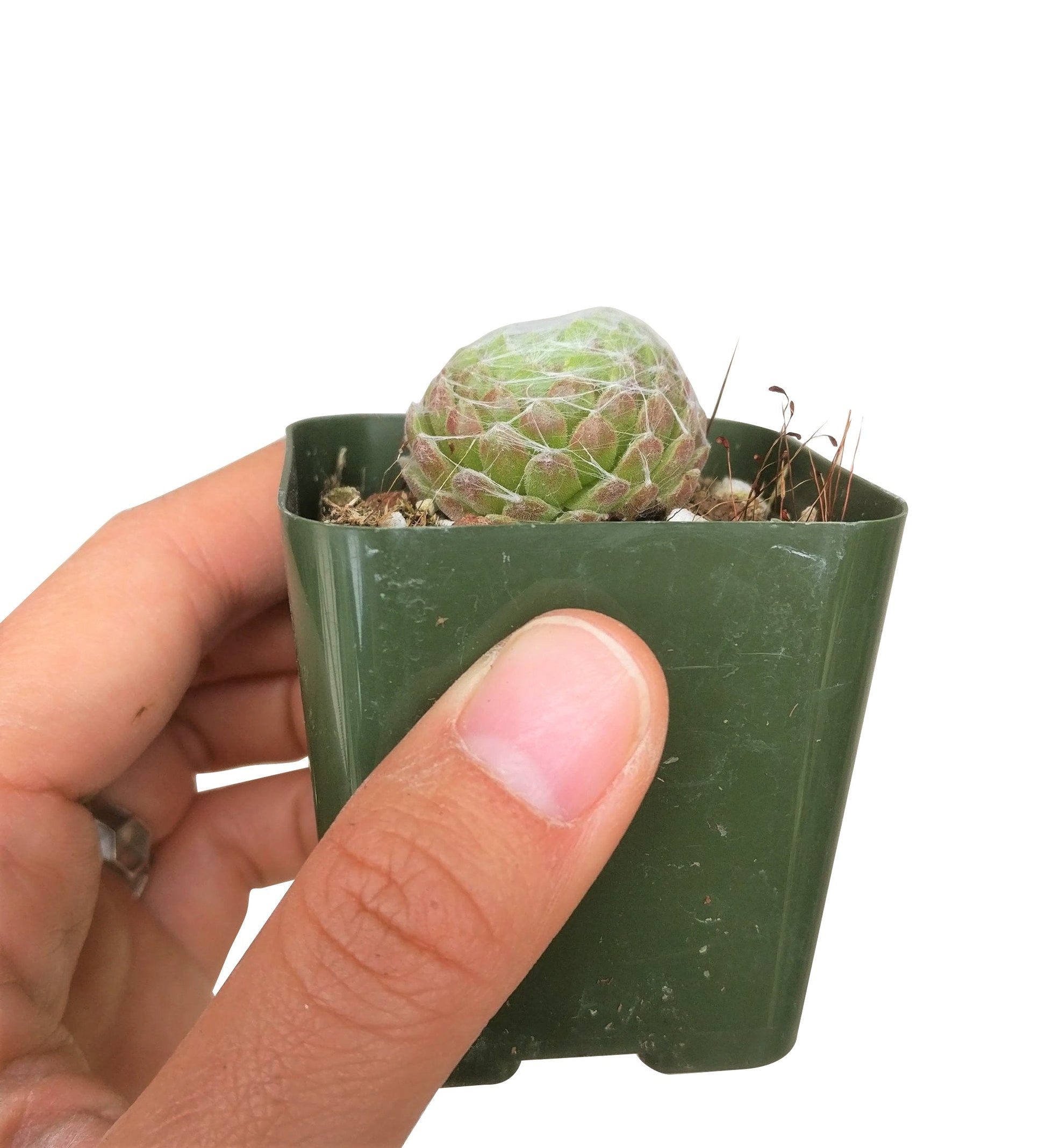 Sempervivum Cobweb- Sempervivum arachnoideum (Cobweb Hens and Chicks) is a small-growing selection of hen and chicks. Their pointy blue-green rosettes are covered with crisscrossing fine white threads that resemble a cobweb.